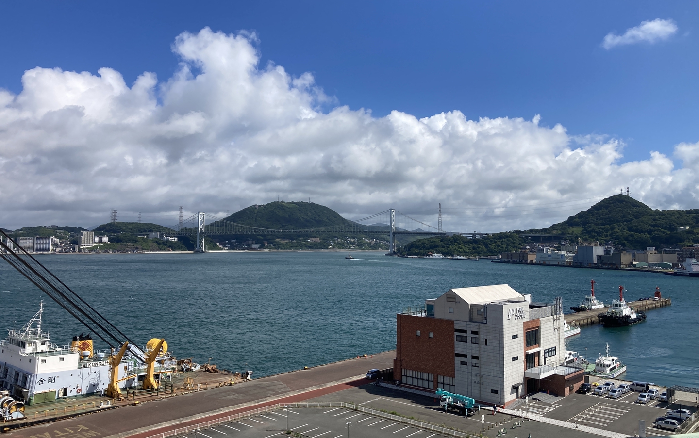 同施設の外観はガラス張りの帆船のような姿をした建物です。エレベーターで5階展望デッキまで登ると、関門海峡が一望できます。