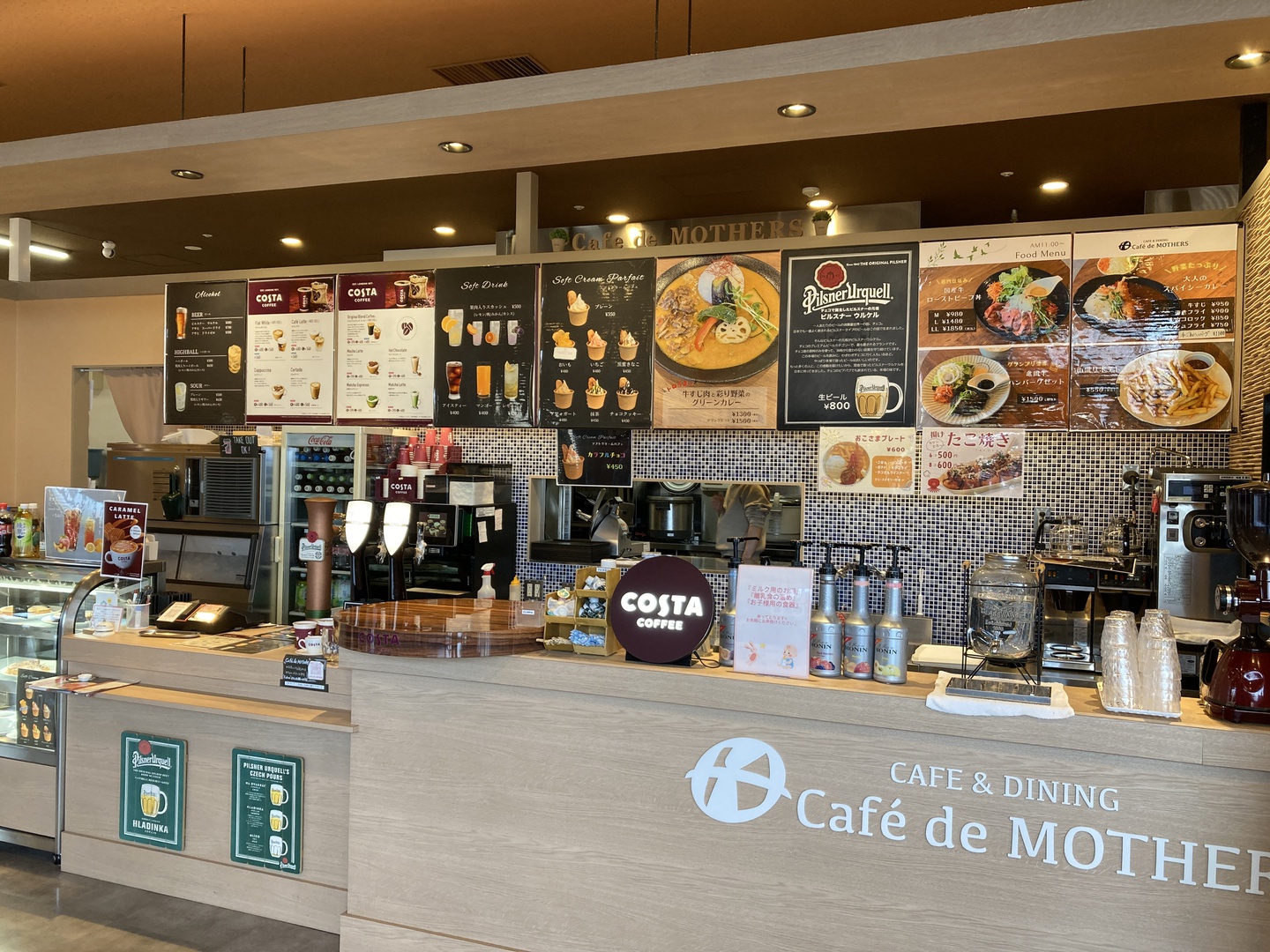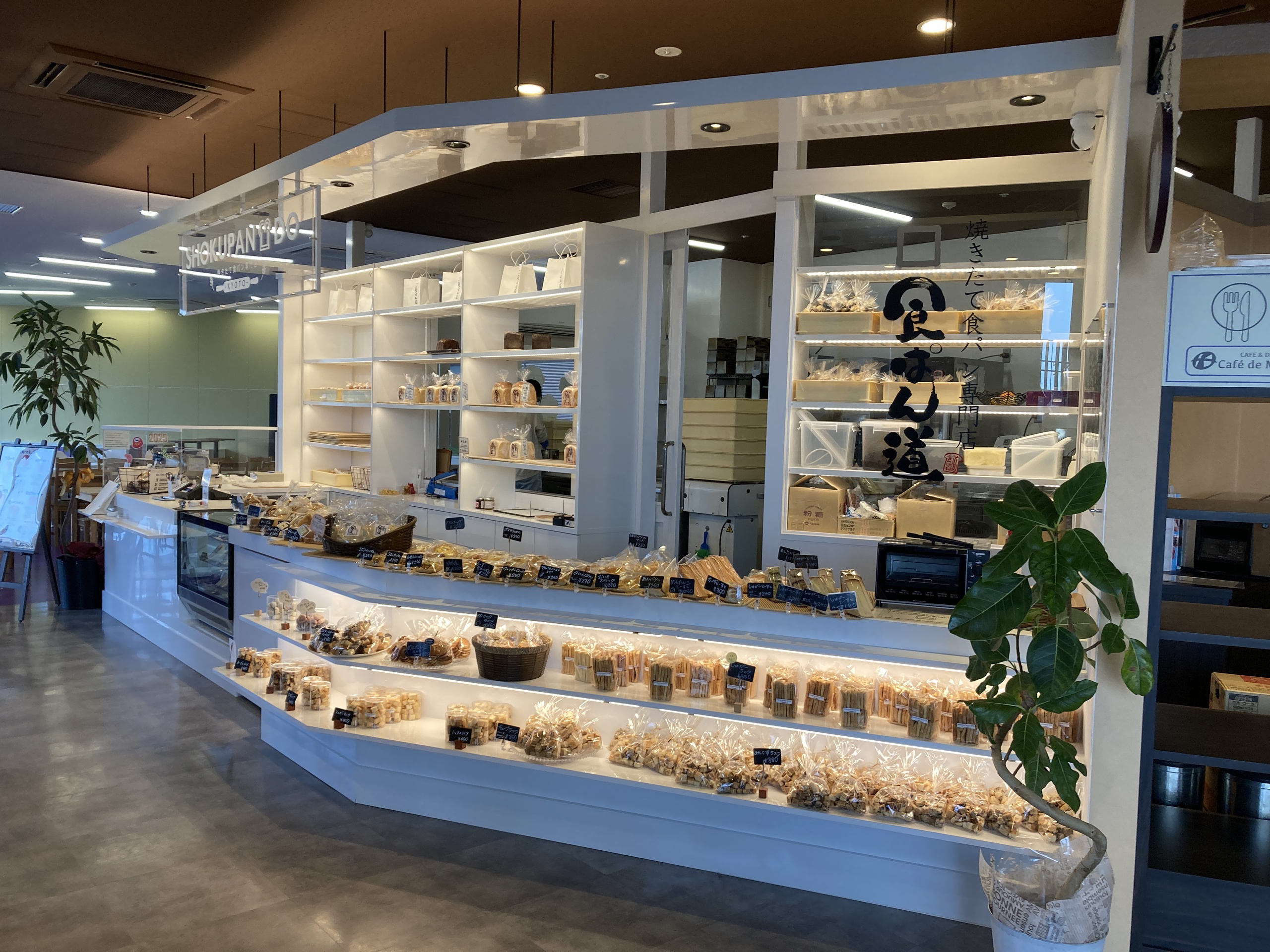 フードコートでは食事やアルコール類も提供されています。また、パン屋さんもあり、焼き立てのパンが販売されていました。